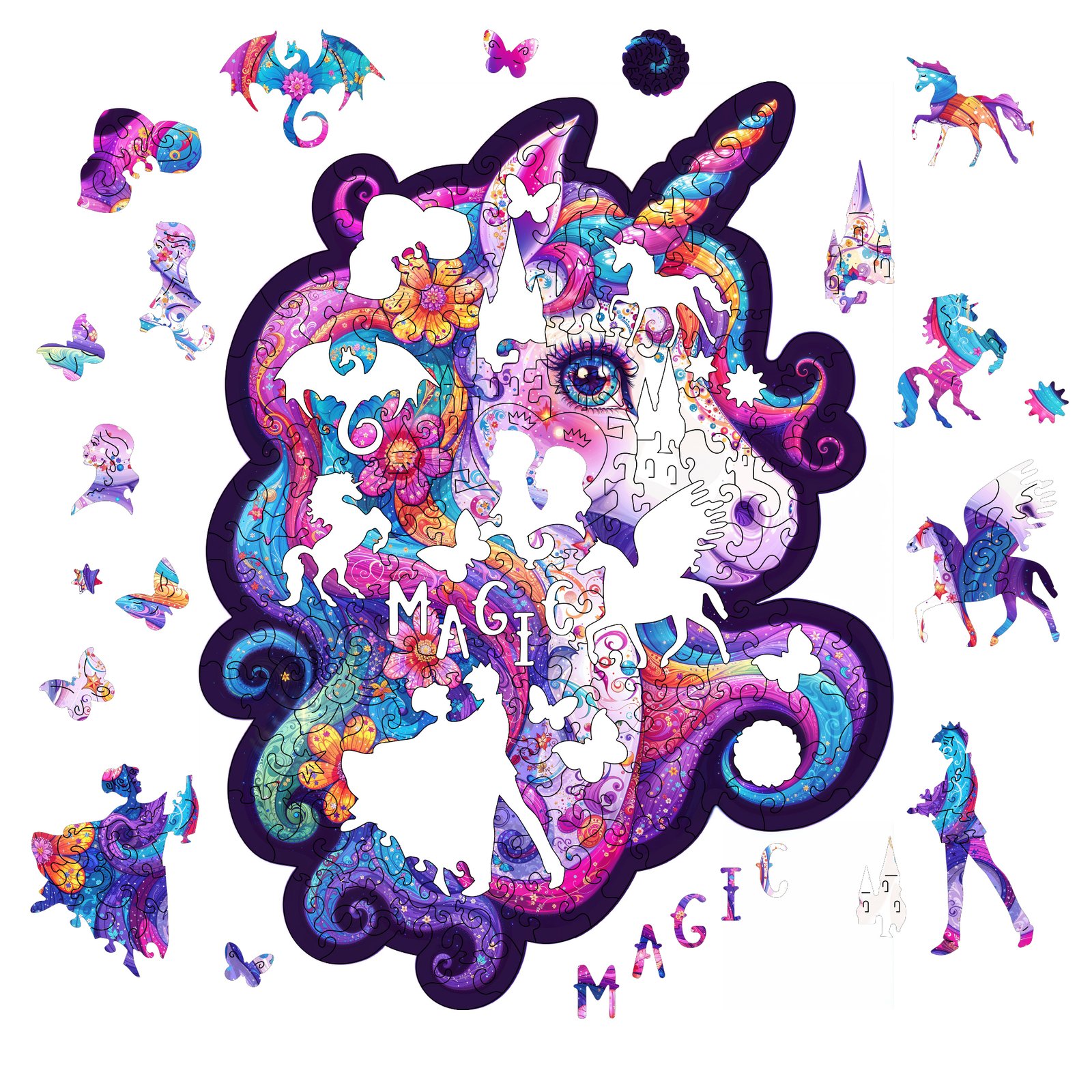 A wooden puzzle in the shape of a Unicorn, consisting of animal shapes, symbols, and irregular shapes, makes it a different experience from any puzzle you may have seen before.